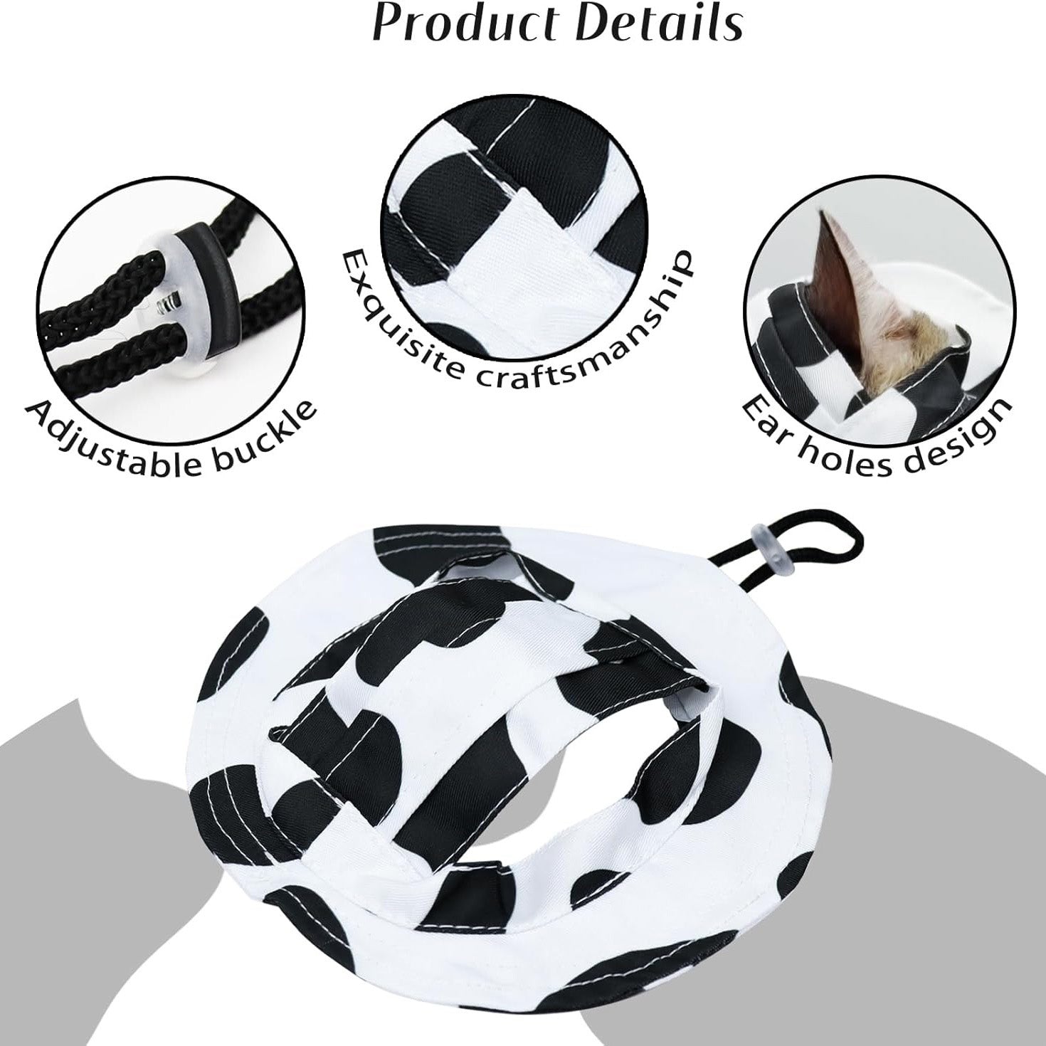 Pet-Friendly Design: Made from soft, comfortable fabric with ear-exposing holes, the hat keeps pets secure while feeling cozy. The adjustable rope buckle ensures a snug fit and prevents slipping.